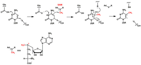 The mechanism of enzymatic methylation of a DNA base (cytosine) by SAM, as catalyzed by DNA methyltransferases (DNMTs). A conserved cysteine residue of a DNMT mediates a nucleophilic attack on the C6 atom of the cytosine ring, and this event initiates the reaction. This attack is also facilitated by a conserved glutamic acid residue. After this attack, transfer of a methyl group from SAM to atom C5 of the cytosine ring takes place. Subsequent deprotonation of C5 resulting in m5C formation is thought to be mediated by a basic group (presented as “B:”) provided by the enzyme. The mechanism is based on data from [42].