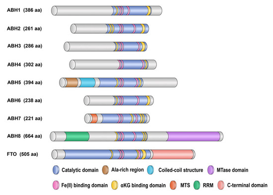 Distribution of key functional elements in ABH enzymes. The catalytic domain (steel blue) includes Fe(II)- and αKG-binding sites (pink and yellow sectors, respectively), and these sites are completely conserved among the nine AlkB human homologs. In ABH5 structure, an amino-terminal alanine-rich region and a potential coiled-coil structure are distinguished, which could be important for its localization [76]. ABH7 also has a specific nonconserved region: a mitochondrial targeting signal (MTS, orange) [84]. ABH8 has an additional RNA recognition motif (RRM, green) and a C-terminal methyltransferase (MT) domain (purple section) [85]. FTO consists of an N-terminal domain, including the catalytic domain, and of a C-terminal domain (interacting with the first one) [86,87]. This image was based on data from [74,76,88].