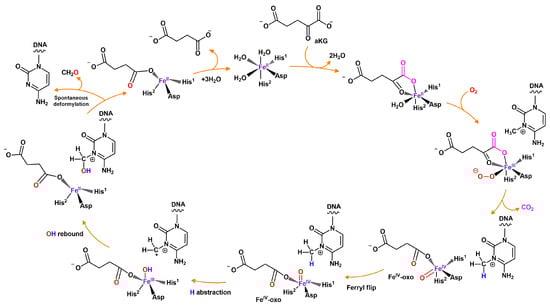 A proposed mechanism of catalytic oxidation of a methylated substrate by AlkB family enzymes, presenting m3C oxidation as an example. The mechanism used by AlkB family dioxygenases to oxidize the methyl group of DNA bases consists of two main stages, namely, dioxygen activation and substrate oxidation itself. Before binding an oxygen molecule, iron is coordinated by two histidine residues (His1 and His2) and aspartate, whereas αKG is coordinated in the enzyme’s active center. Free Fe(II) coordination sites are usually occupied by water molecules. Binding of the substrate in the active center initiates the reaction. During the first stage, αKG is oxidized to succinate and CO2. In this way, a reactive Fe(IV) = O intermediate is formed. In the second stage, the methyl group is hydroxylated by this activated intermediate. Restoration of the original structure of the substrate (cytosine here) proceeds through spontaneous deformylation. This mechanism was based on data from [114,115].