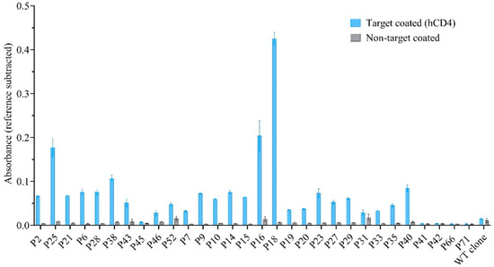 Clones were separately amplified in E. coli ER2738 culture (4.5 h, 37 °C, 250 rpm). After centrifugation (10 min, 25 °C, 4000× g) to remove bacterial cells and debris, the phage-containing supernatant was purified by adding 1/6 volume of PEG/NaCl buffer (20% PEG/2.5 M NaCl). After overnight incubation (4 °C), precipitated phages were retrieved by centrifugation (10 min, 37 °C, 12,000× g) and resuspended in Tris-Buffered Saline (TBS). Monoclonal phage ELISA was used to investigate the binding of 30 individual phage clones. The procedure was performed in triplicate and has been described previously [31]. Briefly, pre-blocked phages (1010 pfu/well) were introduced to hCD4-coated (0.5 µg/well) and non-target (PBS) wells and incubated for 0.5 h with continuous shaking. Unbound phages were removed by washing, and the bound phages were detected using an HRP-conjugated anti-M13 antibody (Sino Biological, Beijing, China) and 3,3′,5,5′-tetramethylbenzidine (Merck, Darmstadt, Germany). Absorbances at 450 (target) and 540 nm (reference) were measured in target-coated and non-target wells using a FLUOstar® Omega reader (BMG Labtech, Ortenberg, Germany). A phage clone was considered a binder if the reference subtracted absorbance exceeded 0.2 in the hCD4-coated well.