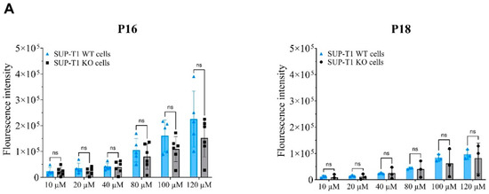 The plate assay did not show a significantly higher fluorescence signal for SUP-T1 WT cells compared to SUP-T1 KO cells, although a tendency toward a higher signal can be observed for the 120 µM peptide concentration for P16 (Figure 2A). The flow cytometry assay indicated no significant difference between the binding of peptides to SUP-T1 WT and SUP-T1 KO cells. Even a tendency toward higher SUP-T1 KO cell binding was observed for both peptides (Figure 2B). Confocal imaging with a FITC-labeled anti-CD4 antibody showed fine membrane staining; however, no fluorescence signal was observed after incubation of the cells with FITC-labeled peptides (Figure 2C).