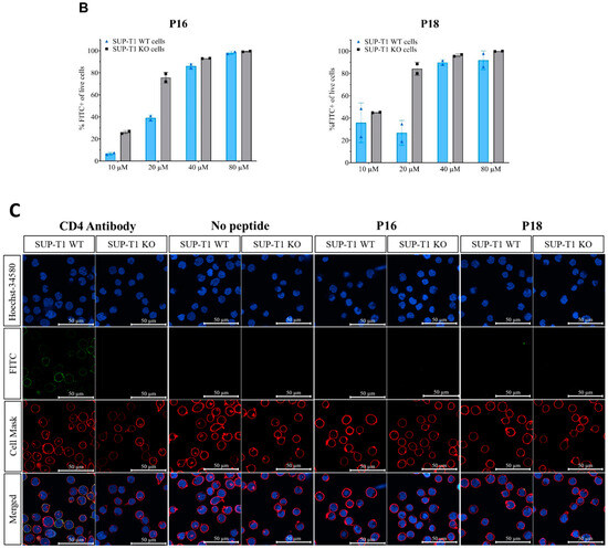 We made a CRISPR-Cas9 knockout of CD4 in the CD4-expressing lymphoblast cell line SUP-T1 to use as a control in the cell binding experiments (Supplementary Materials; Figures S1 and S2). The peptides P16 and P18 were FITC-labeled, and their binding to the two cell lines was measured by the increased fluorescence signal of the WT cell line compared to the CD4-knockout (KO) cell line. The binding of P16 and P18 was assessed by plate-based assay (Figure 2A), flow cytometry (Figure 2B), and confocal microscopy (Figure 2C).