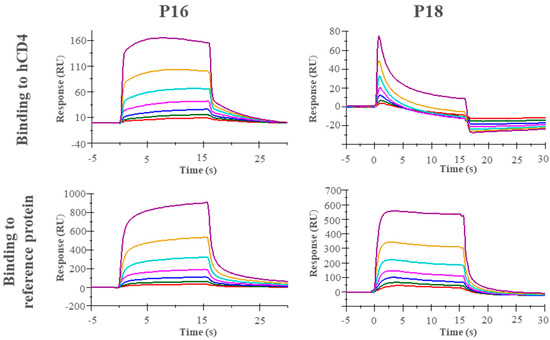 The binding affinity of unlabeled peptides toward recombinant hCD4 was characterized by SPR assay. The hCD4 and reference protein were immobilized, and peptide binding events were recorded for a series of 2-fold dilutions from 100 µM peptide. Subsequently, data were plotted to generate binding curves. The results of SPR (Figure 3) showed a higher signal (response units) for the reference protein compared to hCD4, indicating nonspecific binding of peptides P16 and P18.