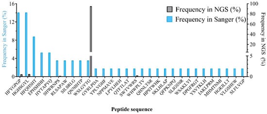 In Figure 5, we made a comparison between the frequency of Sanger-identified peptides in Sanger and NGS datasets. Also, Table S3 (in the Supplementary Materials) contains information about the rank, absolute frequency (copy number), and relative frequency (percentage) of these peptides in the NGS dataset.