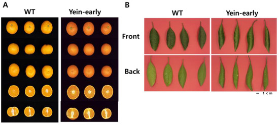 Morphological comparison of fruits (A) and leaves (B) between Yein-early and wild type (WT).