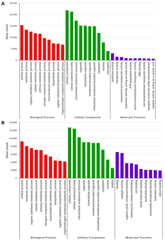 We meticulously annotated the non-synonymous SNPs and InDels in the coding sequence of Yein-early using the GO database, with a focus on gene function alterations. We systematically classified the mutated genes into three main functional categories: Biological Process (BP), Cellular Component (CC), and Molecular Function (MF). Among the genes containing SNPs, 429,369 had BP functions, which were further classified into 501 subcategories, including cellular process (15,397 genes), metabolic process (13,394 genes), organic substance metabolic process (12,518 genes), cellular metabolic process (11,826 genes), and primary metabolic process (11,589 genes). A total of 157,544 genes containing SNPs had CC functions, which included 29 subcategories such as cellular component (21,892 genes), cellular anatomical entity (21,294 genes), intracellular anatomical structure (17,363 genes), organelle (15,205 genes), and intracellular organelle (15,192 genes). A total of 20,836 genes containing SNPs had MF functions. These could be further grouped into 43 subcategories, including hydrolase activity (3,065 genes), transporter activity (1562 genes), transmembrane transporter activity (1,419 genes), hydrolase activity on ester bonds (988 genes), and ATP-dependent activity (868 genes). Among the genes containing InDels, 319,632 had BP functions, including cellular process (9238 genes), metabolic process (8068 genes), organic substance metabolic process (7551 genes), cellular metabolic process (7131 genes), and primary metabolic process (7056 genes). A total of 103,751 genes containing InDels had CC functions, which could be further divided into 100 subcategories, including cellular component (12,727 genes), cellular anatomical entity (12,427 genes), intracellular anatomical structure (10,295 genes), organelle (9026 genes), and intracellular organelle (9017 genes). Finally, 66,768 genes containing InDels had MF functions, which included 169 subcategories such as binding (6558 genes), catalytic activity (6315 genes), organic cyclic compound binding (3779 genes), heterocyclic compound binding (3765 genes), and ion binding (3453 genes; Figure 2).