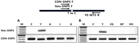 Yein-early selection by allele-specific PCR. (A) C: WT control; Y: Yein-early; A: Ara-unshiu; J: Jedae-unshiu; G: Gownjae-early. (B) C: WT control; Y: Yein-early; J: Jedae-unshiu; CG: Chung-Gyeon; GP: Gam-Pyong; KH: Kara-Hyang. A, J, G: our other citrus variants; CG, GP, KH: commercially available citrus varieties.