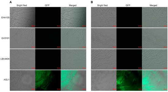 Four A. tumefaciens strains with different genotypes, namely, EHA105, GV3101, LBA4404, and AGL1, were assessed for their ability to mediate the genetic transformation of H. sinensis KK1 and LT4. Empty pCAMBIA2300-35S-GFP vector was separately transformed into each of the above four A. tumefaciens strains, and the transformants were used to infect H. sinensis strains KK1 and LT4. Then, the transient expression of GFP was monitored. The results revealed that only the AGL1 strain exhibited green fluorescence after infecting H. sinensis, indicating that H. sinensis had been successfully infected by AGL1 and that GFP was expressed (Figure 1).