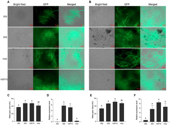 The promoter sequences of the 30s, His3, and HSP70 genes were amplified from KK1 genomic DNA. The pCAMBIA2300-30S-GFP, pCAMBIA2300-His3-GFP, and pCAMBIA2300-HSP70-GFP plasmids were constructed on the basis of the pCAMBIA2300-35s-GFP vector and were subsequently transformed into A. tumefaciens strains AGL1. The H. sinensis strains KK1 and LT4 were subsequently infected separately with positive A. tumefaciens strains carrying the above three plasmids, and the green fluorescence of GFP was detected in all of them (Figure 3A,B), confirming that the above three promoters could activate the expression of GFP. Additionally, the relative expression level of GFP activated by the His3 promoter in the KK1 strain was not significantly different from that activated by 35S, but the relative expression level of GFP activated by the promoters of the 30s and HSP70 genes significantly differed from that activated by 35S (Figure 3C). The relative expression levels of GFP activated by the three promoters in the LT4 strains were significantly greater than those activated by 35S (Figure 3E). In both KK1 and LT4 strains, the mean gray values of the graph of GFP activated by the promoter of the 30s and HSP70 gene were significantly different from those activated by the 35S (Figure 3D,F).