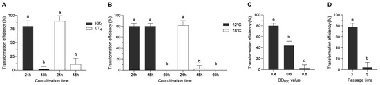 The concentration of A. tumefaciens plays a crucial role in fungal genetic transformation. In this study, AGL1 suspensions with OD600 values of 0.4, 0.6, and 0.8 were mixed with KK1 suspensions at a volume ratio of 1:3. After being cocultured at 18 °C for 24 h, the transformation efficiency reached 80% when the optical density of the AGL1 suspension was 0.4, whereas the transformation efficiency was as low as zero when the optical density of the AGL1 suspension was 0.8 (Figure 5C).