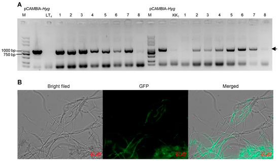 Eight positive transformants were randomly selected from strains LT4 and KK1 to extract genomic DNA, and PCR was used to amplify the target band of the Hyg gene. The electrophoresis results revealed that seven positive LT4 transformants and six positive KK1 transformants produced the target band (Figure 6A). The six positive KK1 transformants were subsequently selected for culture on basic medium. After 30 days of cultivation, the mycelial pieces on the edge of the colony were transferred to fresh basic medium for culture and then transferred to the selection medium containing 25 μg/mL hygromycin B after three consecutive subcultures. The results showed that these six transformant strains could still grow normally. The results confirmed that the exogenous T-DNA structure was successfully inserted into the strain KK1 genome and could be stably inherited (Figure 6B).