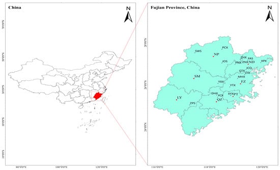The experimental materials were collected from 18 counties, across 7 cities in Fujian Province, comprising a total of 137 samples from 7 populations (Figure 1 and Figure 2; Table 1).