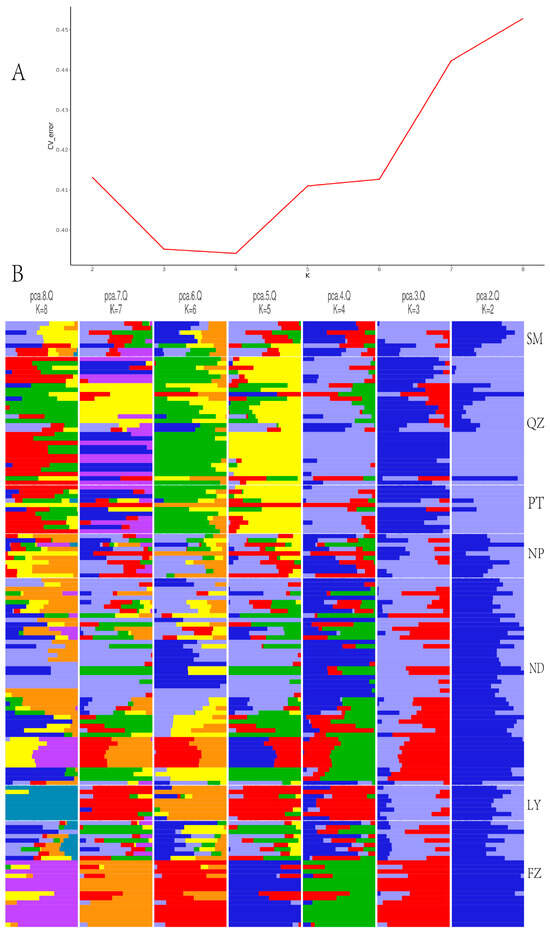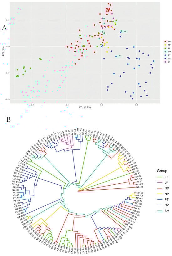 Using Admixture software, a genetic structure analysis was conducted on the 15,158 SNP loci that were filtered. The range for the K values was set from two to eight, and the corresponding CV error values were obtained and are depicted in a line graph (Figure 3A). When K = 4, the CV error value was minimized, indicating that the 137 individuals could be divided into four distinct clusters (Figure 3B). According to the PCA, the individuals from QZ and PT were concentrated, while the individuals from ND, LY, FZ, SM and NP were also clustered together, with a few individuals from FZ scattered elsewhere (Figure 4A).