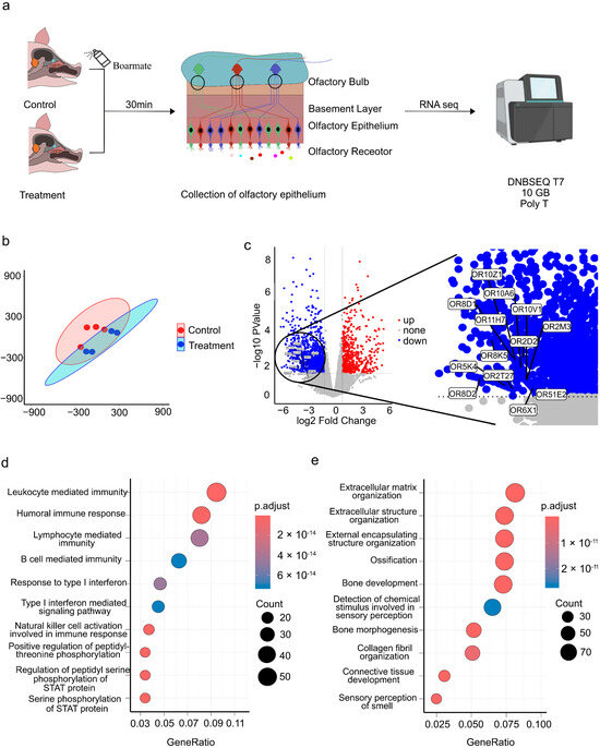 Transcriptomic change in pigs’ olfactory epithelium upon androstenone treatment. (a) Flowchart of sampling and transcriptome sequencing. (b) tSNE clustering of RNA-seq samples; red and blue represent samples from the control group and the androstenone treatment group, respectively. (c) Volcano plot of DEGs. (d) Top 10 GO terms of the up-DEGs. (e) Top 10 GO terms of the down-DEGs.