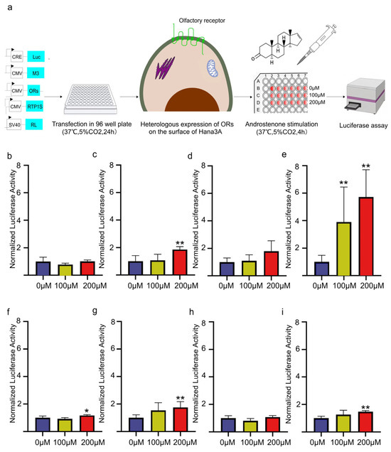 Response of the olfactory receptors to different concentrations of androstenone. (a) Flowchart of the heterologous expression and functional assay of ORs. (b) Response of the control group (not transfected with ORs) to androstenone. (c) Response of OR2D2 to androstenone. (d) Response of OR6X1 to androstenone. (e) Response of OR7D4 to androstenone. (f) Response of OR8D1 to androstenone. (g) Response of OR8D2 to androstenone. (h) Response of OR10V1 to androstenone. (i) Response of OR10Z1 to androstenone. The different colours of columns represent the different concentrations of adrostenone. The error bar represents SEM, * represents p < 0.05 and ** represents p < 0.01.