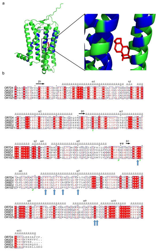Potential key sites mediating the response to androstenone of pig OR7D4. (a) Molecular docking plot. Simulated docking results of pig OR7D4 with androstenone molecules marked in red. Binding cavity predicted are marked in blue. (b) Alignment of androstenone ORs of pigs. Relatively conserved sites in the binding cavity of pig OR7D4 are marked by arrows. Highly conserved loci are marked in red, with 10 loci between each black dot. Secondary structures are shown above the sequence.