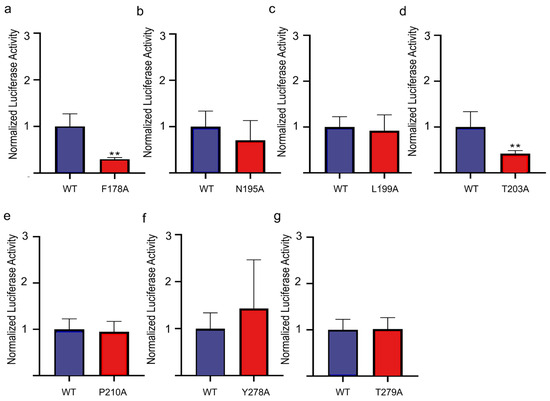 Next, we hypothesized that the key residues mediating the response of ORs to androstenone are relatively conserved among the series of androstenone-activated ORs due to being activated by the same odor [16]. Therefore, a total of seven potential androstenone relatively conserved sites were screened within the ligand-binding cavity of pig OR7D4 with the potential to mediate the response to androstenone (Figure 3b, Figures S2 and S3). These sites with relatively high similarity are all located in the transmembrane helixes of pig OR7D4, as well as in the second extracellular loop, with four located on TM5 and two located on TM7 and one located on ECL2 (Figure S3). Last, alanine scanning of these seven loci further confirmed that F178A and T203A significantly decreased the response of pig OR7D4 to androstenone in vitro, which suggests they are the key structural determinants of pig OR7D4 (Figure 4).