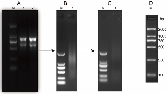 Process of total RNA extraction, mRNA purification, and double-stranded-complementary DNA (ds-cDNA) synthesis. (A) Total RNA was extracted from the shoot apical meristem (SAM) of B. napus. (B) mRNA was isolated from total RNA. (C) ds-cDNA was synthesized. (D) DL 2000 DNA Marker, 1 and 2: RNA, mRNA or cDNA from B. napus SAM.