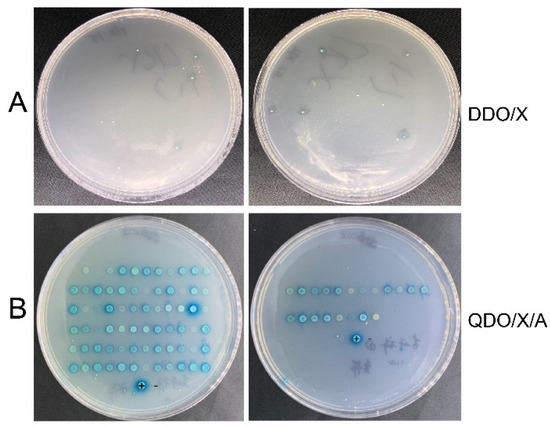 The bait vector pGBKT7-BnTFL1s (5 μL) and the Secondary Library Plasmid of B. napus SAM (10 μg) were co-transformed into Y2H Gold yeast cells using the LiAc transformation method. The conversion solution was suspended in 0.9% NaCl solution to a total volume of 6 mL, and all cells were coated on DDO/X plates for preliminary screening. Each plate was coated with 80 μL, approximately 80 pieces; then, they were cultivated at a constant temperature of 30 °C for 3−5 days and grown with monoclonal antibodies to a size of 1–2 mm. The blue clones that formed on the DDO/X plates during this preliminary screen were transferred to QDO/X/A plates for secondary, high-stringency screening. These plates were also incubated at 30 °C for 3–5 days. Finally, clones that could grow normally and appeared blue were selected for a comparison with positive controls for PCR detection and sequencing.