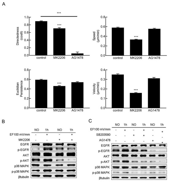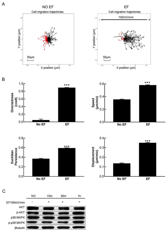 In addition, Akt (a downstream signaling molecule of the PI3 kinase pathway) is also involved in diverse cell behaviors [8,9]. EFs may induce Akt activation in diverse cells [10]. Studies of human renal tubular epithelial cells have shown that their migration direction and speed in EFs were significantly inhibited after treating cells with inhibitors of p38 MAPK and Akt, respectively [11], and that the p38 MAPK/Akt signaling axis may regulate the migration of vascular smooth muscle cells [12].