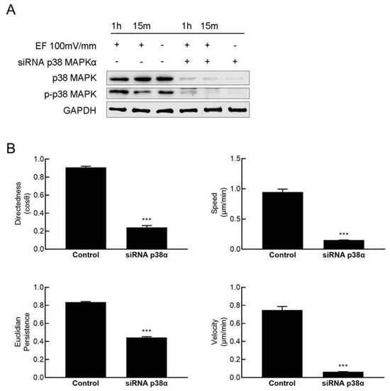 To study the role of p38 MAPK in electric field-guided HaCaT cell migration, p38α was knocked down by RNAi. Western blotting confirmed that the expression and phosphorylation of p38 MAPK were significantly interfered by RNAi (Figure 2A). Depletion of p38 MAPK by siRNA significantly abolished the migration of HaCaT cells in the EF. The migration directedness, velocity, track speed, and Euclidian persistence were significantly decreased compared to those of the control (Figure 2B).
