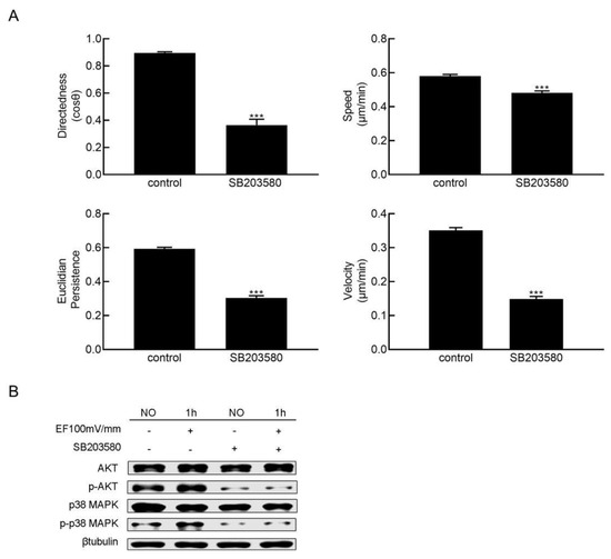 Treating HaCaT cells with the p38 MAPK inhibitor SB203580, the directedness, Euclidian persistence, velocity, and the migration speed of HaCaT cells in the EF were obviously reduced (Figure 3A). Western blotting showed that SB203580 treatment obviously inhibited the phosphorylation of p38 MAPK and Akt in HaCaT cells (Figure 3B).