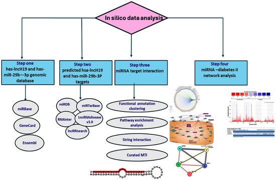 The in silico data analysis workflow is depicted in Figure 1. Several computational prediction tools were utilized to identify the target genes for both miRNA29b and lncH19. They included miRBase (https://www.mirbase.org/) and miRDB (https://mirdb.org/), which were last accessed 2 January 2024. An intersection of the results and statistical validation/filtration were applied to reduce the false-positive prediction rate.