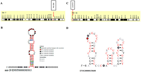 Figure 3. MicroRNA-29B and lncH19 gene structural analysis. (A) miRNA-29b chromosomal location and (B) miR-29b secondary structure, (C) lncH19 chromosomal location, and (D) lncH19 secondary structure. Source: https://useast.ensembl.org/Homo_sapiens/Gene/; last accessed 25 December 2024). - Sequence characteristics: the mature miR-29b sequence is 22 nucleotides long, with the following sequence: 5′-UAGCACCAUUUGAAAUCAGUGUU-3′ [29].