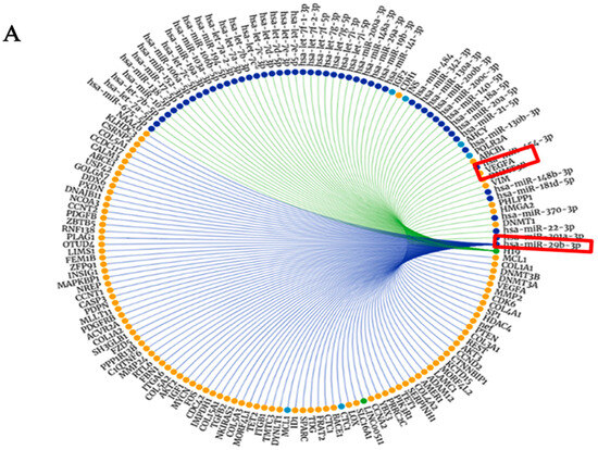 MiR-29b-3p, lncH19, and VEGF evidence of cross interactions. (A) miR-2b with VEGF; (B) lncH19 loop interaction with miR-29b and VEGF.