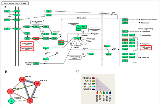 Interaction analysis for “PI3K/AKT/HIF-1” pathway. (A) Target pathways and genes (red boxes) in enriched KEGG pathway. The original pathway is adopted with permission (https://www.kegg.jp/pathway/map04066) (last accessed 20 November 2024) [23], (B) protein–protein interaction and clusters, and (C) coexpression analysis (Data sources: STRING database).