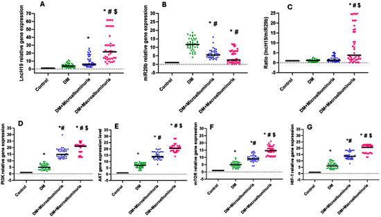 Gene expression among the four investigated groups, including the DM (green), DM with microalbuminuria (blue), and DM with macroalbuminuria (red) for lncH19 (panel A), miR-29b (panel B), their ratio (panel C) and target genes (i.e., panel D: PI3K, panel E: AKT, panel F: mTOR, and panel G: HIF-1). Data are presented as median and interquartile range; Kruskal–Wallis was employed to calculate the p-values, where * denotes a significant difference vs. the control group, # indicates a significant difference vs. the DM group, and $ indicates significant differences vs. the microalbuminuria group at p < 0.05.