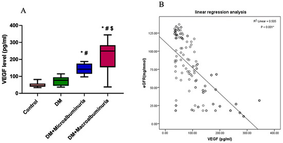 There was a significant increase in VEGFA in patients in the micro- and macroalbuminuric groups than in those in the DM or the control group (Figure 7A). Moreover, a significant negative correlation was found between serum levels of VEGF and eGFR (p < 0.001) (Figure 7B).
