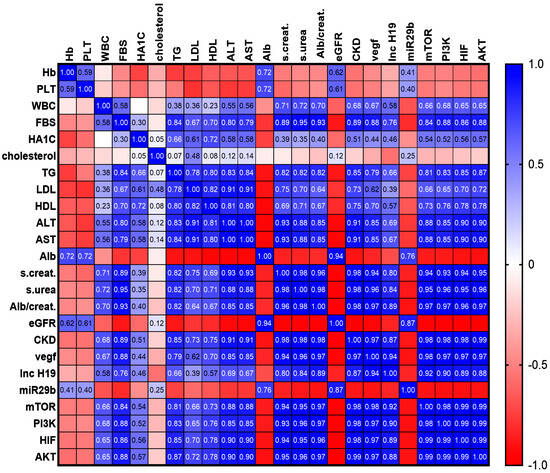 The matrix showed a significant and robust positive correlation between the lncH19 level and VEGFA, mTOR, HIF-1, PI3K, and AKT (R2 = 0.94, 0.92, 0.89, 0.9, 0.88, respectively) and a weak negative correlation with miR-29b and eGFR (R2 = −1) (Figure 8).