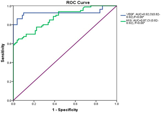 ROC analysis demonstrated that the serum VEGF level, which served as the cut-off value of 96.04 pg/mL, had a sensitivity of 96% and a specificity of 90% with an area under the curve (AUC) = 0.92 and a statistical significance difference less than 0.001. In contrast, lncH19 had a sensitivity of 92% and a specificity of 57%, with an area under the curve (AUC) = 0.87 and a significant difference of less than 0.001 (Figure 9).