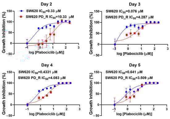 Growth inhibition of SW620 cells and resistant SW620 cells exposed to different concentrations of palbociclib for 2 days, 3 days, 4 days, and 5 days. Blue represents SW620 cells, and red represents SW620 PD_R cells.