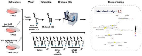 SW620 PD_R and SW620 cells that were treated once with 1 μM palbociclib were set as study groups, while SW620 cells without any treatment were used as the control group. Cells were collected when the cell density reached 80%. For sample preparation, the cells were first rinsed with PBS twice and then with ammonium formate solution at a concentration of 150 mM. Afterward, 1.2 mL of 50% MeOH was added into each well for the extraction of intracellular metabolites. Samples were completely lysed using an ultrasonic homogenizer in an ice bath for 30 min and centrifuged at 14,000 rpm under 4 °C for 5 min. The supernatant was collected at overnight and stored at −80 °C before LC-MS analysis.
