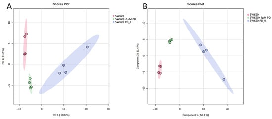 Score plots of the PCA (A) and PLS-DA (B) models for the metabolome data obtained by LC-MS showing the metabolic profile differences between the control and palbociclib-treated groups. Red cycle: control group; green cycle: SW620 + 1 μM PD group; blue cycle: SW620 PD_R group.