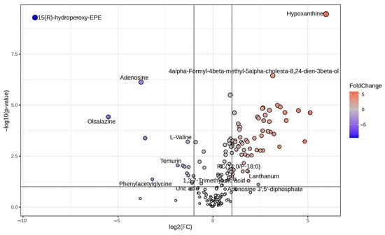 Volcano plot analysis of differential metabolites in drug-resistant SW620 cells. The x-axis represents log2 (fold change), while the y-axis represents the p-value in −log10 scale. The significantly upregulated metabolites are indicated in orange polka dots and those downregulated in blue polka dots (p < 0.05 and fold change > 1.5 or <0.75).