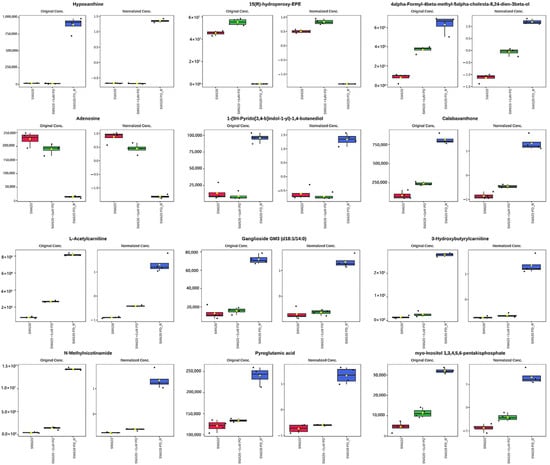 Significantly altered metabolites among the control and the palbociclib-treated groups. The box and whisker plots on the left show the original peak intensity values (mean ± SD). The box and whisker plots on the right summarize the normalized values. Red represents the expression level of metabolites in SW620 cells, green represents the expression level of metabolites in SW620 + 1 μM PD cells, and blue represents the expression level of metabolites in SW620 PD_R cells.