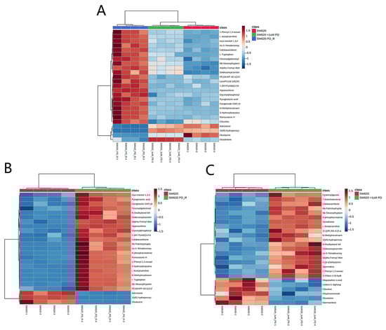 Hierarchical clustering heat map of the top 25 differential metabolites selected based on t-tests/ANOVA, with the degree of change marked with red (upregulation) and blue (downregulation). The distance measure was set to “Euclidean”, and the clustering algorithm was set to “Ward”. (A) Control group, SW620 + 1 μM PD group, and SW620 PD_R group. (B) Control group and SW620 PD_R group. (C) Control group and SW620 + 1 μM PD group.