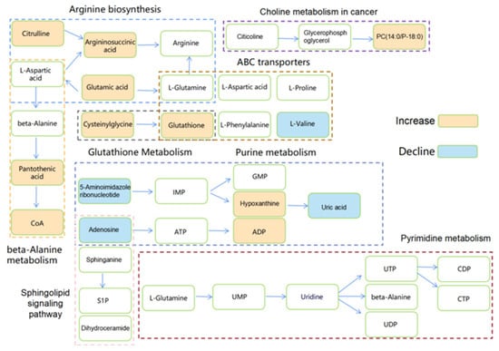 Schematic diagram of regulated metabolites and potential dysregulated metabolic pathways. Detected upregulated metabolites are shown with an orange background; downregulated metabolites are shown with a blue background; a blank background indicates no statistical significance or undetected. Abbreviations: CoA, coenzyme A; IMP, hypoxanthine; GMP, guanosine monophosphate; ADP, adenosine 3′,5′-diphosphate; UMP, uridine 5′-monophosphate; UTP, uridine triphosphate; UDP, uridine 5′-diphosphate; CDP, cytidine diphosphate; CTP, cytidine triphosphate.