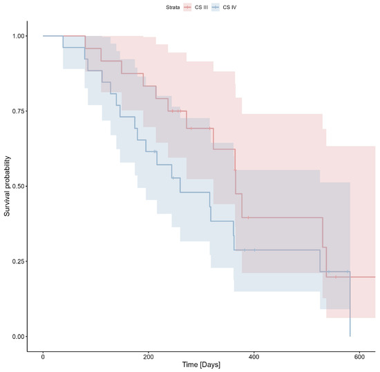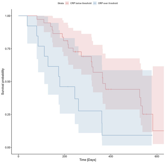 C-reactive protein levels were assessed in 48 patients with a median value of 5.65 mg/dL (IQR: 2.65–29.7 mg/dL). There were statistically significant differences between patients with different clinical stages (n = 23, median 2.9 mg/dL, IQR 1.8–14.6 mg/dL and n = 25, median 27.8 mg/dL, IQR 4.4–60.8 mg/dL for CS III and CS IV, respectively; Mann–Whitney U test p = 0.002). There were no statistically significant correlations between CRP levels and variables such as BMI and age (Spearman’s rho with p > 0.05). There were statistically significant differences in CRP levels between patients with a history of pulmonary disease (asthma or chronic obstructive pulmonary disease) and the rest of the patients. Median CRP levels were 37.8 mg/dL (n = 4; IQR: 28.8–113.3 mg/dL) in patients with a history of pulmonary disease and 5.5 mg/dL (n = 44; IQR: 2.6–24.2 mg/dL) in patients without a history of pulmonary disease (Mann–Whitney U test p = 0.03). Detailed data are presented in Supplementary Table S2. The cut-off value of 24.7 mg/L was determined using ROC analysis (Youden index = 0.29) and applied to the survival analysis. The Kaplan-Meier estimator for CRP is shown in Figure 4; Cox’s F test p = 0.007.