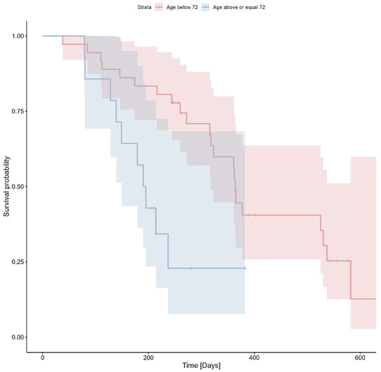 The median age of the included patients was 67.5 years with an IQR of 60–72 years. Age was correlated with observed overall survival (Spearman’s rho-coefficient −0.4 with p = 0.004). Using ROC analysis, a threshold age of 72 years was identified as the cut-off point for poor prognosis (Youden index 0.38).