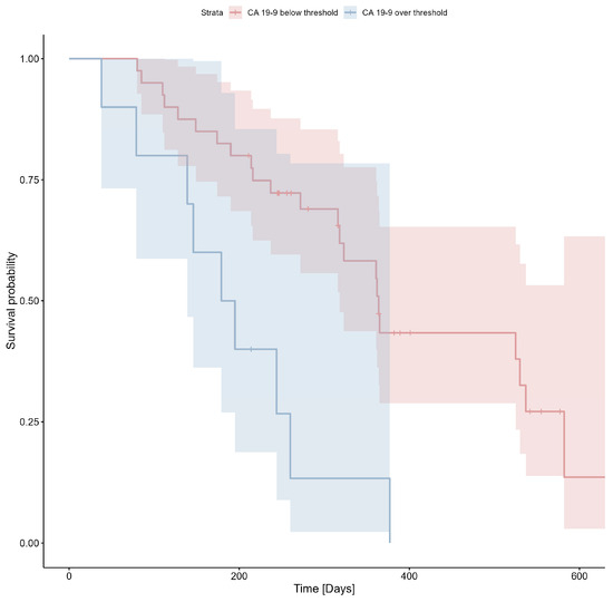 The cut-off value of 4691 U/mL was determined using ROC analysis (Youden index = 0.34) and applied to the survival analysis. The Kaplan–Meier estimator for CA19-9 is shown in Figure 3; Cox’s F test p = 0.007.