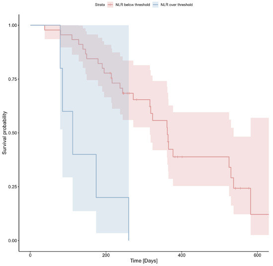 The threshold of 6.63 for NLR was determined using ROC analysis (Youden index = 0.23) and applied to the survival analysis. The Kaplan–Meier estimator for NLR is shown in Figure 5; Cox’s F test p = 0.002.