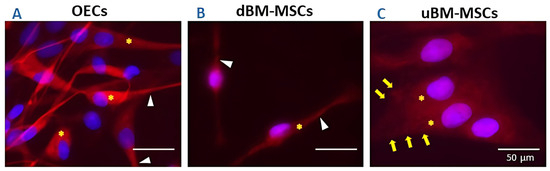 We analyzed the pattern of GFAP filament organization in OECs, dBM-MSCs, and uBM-MSCs using a 40× objective. We observed that GFAP filaments were diffusely organized in all groups. The OECs showed a diffuse GFAP in mostly spindle-like morphology with long extensions (Figure 2A, white arrows). The dBM-MSCs present the same pattern of GFAP predominately in cell types with spindle-like morphology (Figure 2B, white arrows). The uBM-MSCs showed a diffuse GFAP in cells with fibroblast and flattened morphology (Figure 2C, yellow arrows). GFAP exhibits a uniform, finely granular pattern in all groups, appearing dense and diffusely distributed in the cytoplasm, but excluding the nuclei (Figure 2, asterisk); this pattern was originally reported in cells with active migration [23]. These findings reveal that the GFAP pattern in OECs, dBM-MSCs, and uBM-MSCs may be related to active migration.