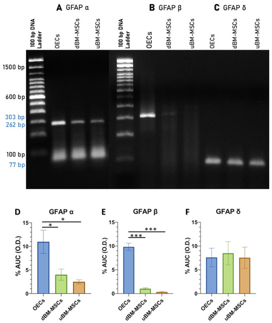 Expression of GFAPα, GFAPβ, and GFAPδ isoforms in OECs, dBM-MSCs, and uBM-MSCs by PCR. (A) The expression of the isoforms of GFAPα was observed at 262 bp. (B) The expression of the isoforms of GFAPβ was observed at 303 bp. (C) The expression of the isoforms of GFAPδ was observed at 77 bp. Optical densitometry analysis of isoforms, all expressed as a percentage of the area under the curve to GFAPα (D); GFAPβ (E); GFAPδ (F). Data are presented as mean ± SEM. Statistical significance was determined by ANOVA and Tukey’s post hoc tests (n = 3) * p < 0.05, *** p < 0.001. OECs: olfactory ensheathing cells, BM-MSC: bone marrow mesenchymal stem cell, dBM-MSC: differentiated BM-MSC, uBM-MSC: undifferentiated BM-MSC.
