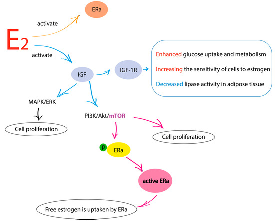 Estrogen targets. E2-estrogen; ERa—estrogen receptor a; IGF—insulin-like growth factor; IGF-1R—insulin-like growth factor 1 receptor; MARK/ERK—mitogen-activated protein kinase/extracellular signal-regulated kinases; PI3K/Akt/mTOR—phosphoinositide 3-kinases/protein kinase B/mammalian target of rapamycin.