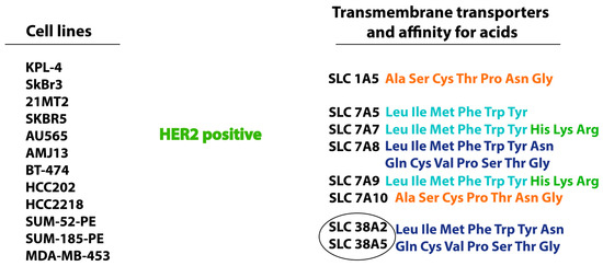 Cell lines, transmembrane transporters, and amino acids related to the HER2 positive subtype of breast cancer. The circled group represents a group of transmembrane amino acid transporters with a common affinity for amino acids. Anionic amino acids: Glu, Asp; small neutral amino acids: Ala, Ser, Cys, Thr; all neutral amino acids: Leu, Ile, Val, Asn, Gln, Gly, Cys, Met, Phe, Pro, Ser, Thr, Trp, Tyr; cationic amino acids: His, Lys, Arg; large neutral amino acids: Leu, Ile, Met, Phe, Trp, Tyr.