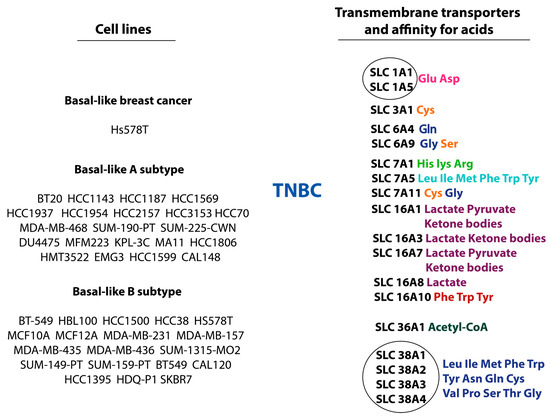 The monocarboxylic acid transporter family includes SLC16A1, SLC16A3, SLC16A7, SLC16A8, and SLC16A10, which are mainly involved in the transport of lactate, pyruvate, aromatic amino acids (phenylalanine, tryptophan, and tyrosine), and ketone bodies. It is known that the monocarboxylate transporter, along with the glucose transporter GLUT1, has increased expression in TNBC, since there is excessive absorption of glucose and lactose by cancer cells, which increases the rate of glycolysis [99]. High expression of isoenzymes such as lactate dehydrogenase-A (LDHA) and lactate dehydrogenase-B (LDGB) in TNBC confirms the dependence of cells in this subtype of breast cancer on anaerobic glycolysis and correlates with a poor prognosis [100]. However, no separate studies have been conducted regarding the expression of the monocarbonate acid transporter family and a specific type of cancer. Only one study has performed a pan-cancer study on SLC16A10 expression. It has been shown that some members of the SLC16 family can be used for cancer prognosis and confirmed the association with immune invasion and the presence of a stem cell phenotype [101]. Particular attention is paid to tryptophan transport and the risk of developing hypertryptophanemia and tryptophan metabolism via the kynurenine pathway, which is immunosuppressive [102]. Studying the relationship between TNBC and the expression of SLC16 family transmembrane transporters is promising for understanding the metabolic features of TNBC and developing therapeutic targets.